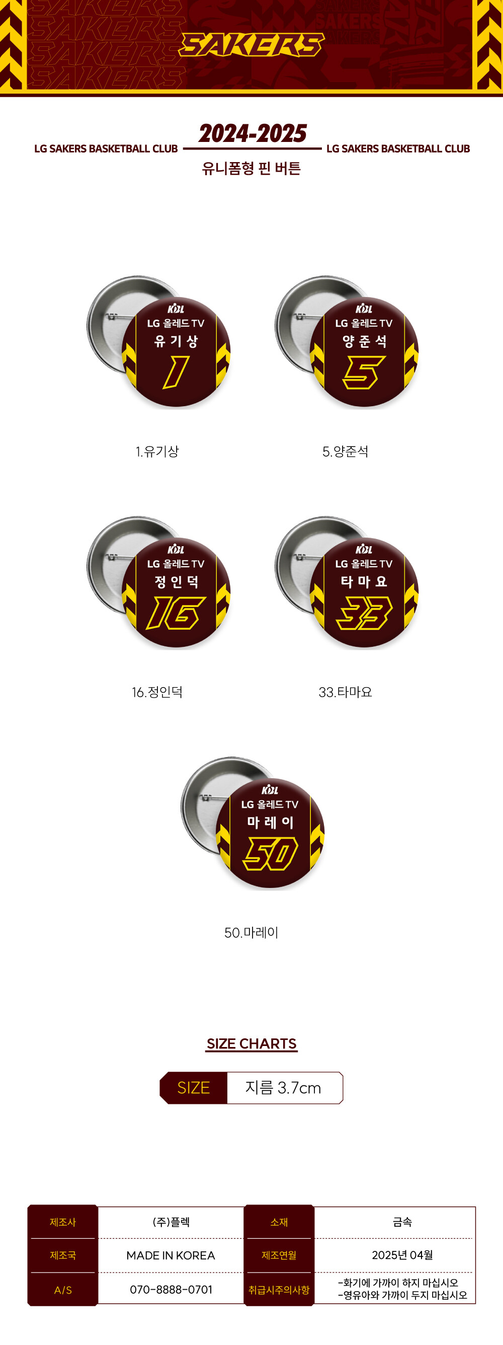 24-25 LG세이커스 플레이오프 선수 핀버튼