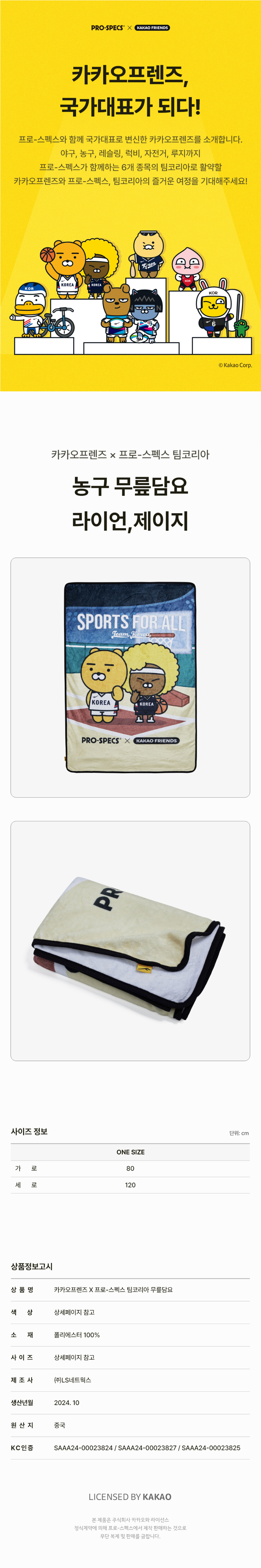 [카카오프렌즈 X 팀코리아] 농구 무릎담요_라이언,제이지